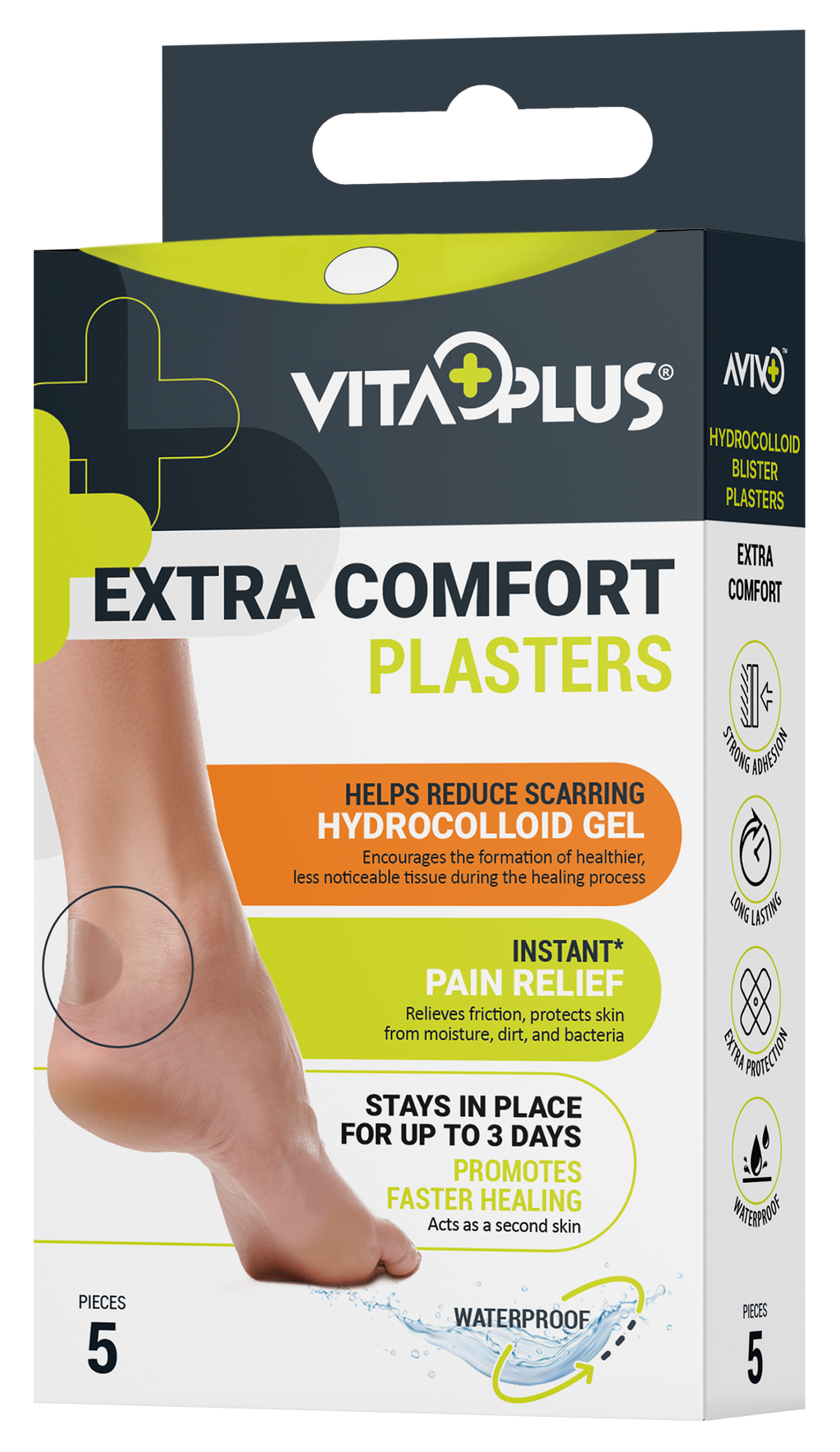 The extra comfort design ensures a secure fit that stays in place even in high-motion areas such as heels and toes. The plasters are waterproof, breathable and discreet, offering long-lasting comfort and protection throughout the day. Whether you're active, on the go or simply seeking relief, the VitaPlus Hydrocolloid Blister Plasters are the reliable choice for treating blisters effectively and comfortably.